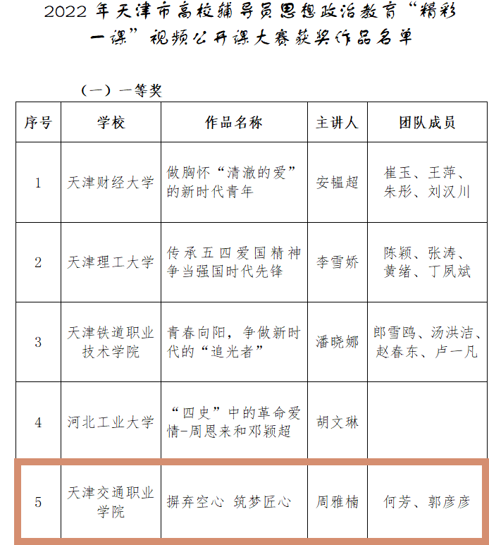 近日,天津市委教育工委、市教委发布《关于公布2022年天津市高校辅导员思想政治教育“精彩一课”视频公开课大赛获奖作品及优秀组织单位的通知》,由bat365周雅楠老师主讲,何芳 郭彦彦老师作为团队成员报送的参赛作品《摒弃空心 筑梦匠心》荣获大赛一等奖,为学院争得荣誉!