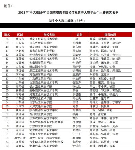 大赛经历校赛、省(市)赛和国赛三个阶段。bat3652022级城市轨道车辆应用技术4班的高磊同学,从校赛和天津市级比赛中脱颖而出,闯入由全国27个省市623所高职院校1066名学生组成的全国赛学生个人赛决赛。最终,高磊同学通过全国赛学生个人赛客观赛段、主观题赛段、答辩赛段的激烈角逐,斩获“2023年‘中文在线杯’全国高职院校信息素养大赛”学生个人赛二等奖的优异成绩。