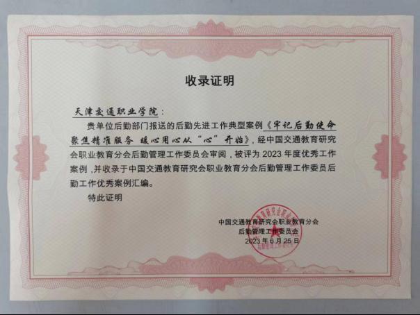 根据中国交通教育研究会职业教育分会后勤管理工作委员会文件要求,后勤部报送了名为《牢记后勤使命聚焦精准服务暖心用心从“心”开始》的后勤先进工作典型案例。经中国交通教育研究会职业教育分会后勤管理工作委员会审阅,被评为2023年度优秀工作案例,并收录于中国交通教育研究会职业教育分会后勤管理工作委员后勤工作优秀案例汇编。