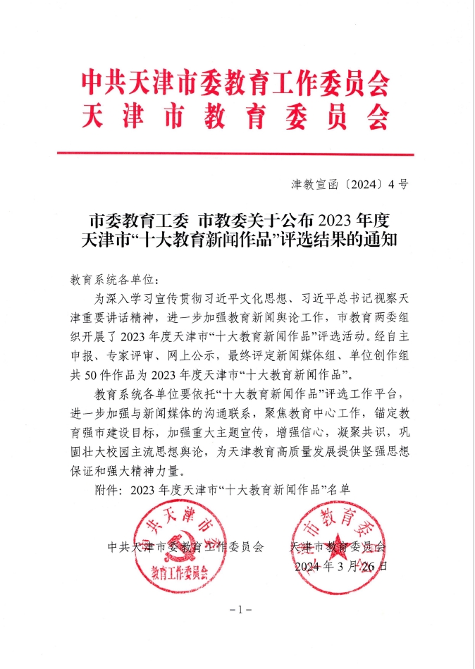 为深入学习宣传贯彻习近平文化思想、习近平总书记视察天津重要讲话精神,进一步加强教育新闻舆论工作,市教育两委组织开展了2023年度天津市“十大教育新闻作品”评选活动。经自主申报、专家评审、网上公示,学院《全国智能供应链行业产教融合共同体在津成立》《壮志豪情浴火青春》两部作品成功获评天津市“十大教育新闻作品”。