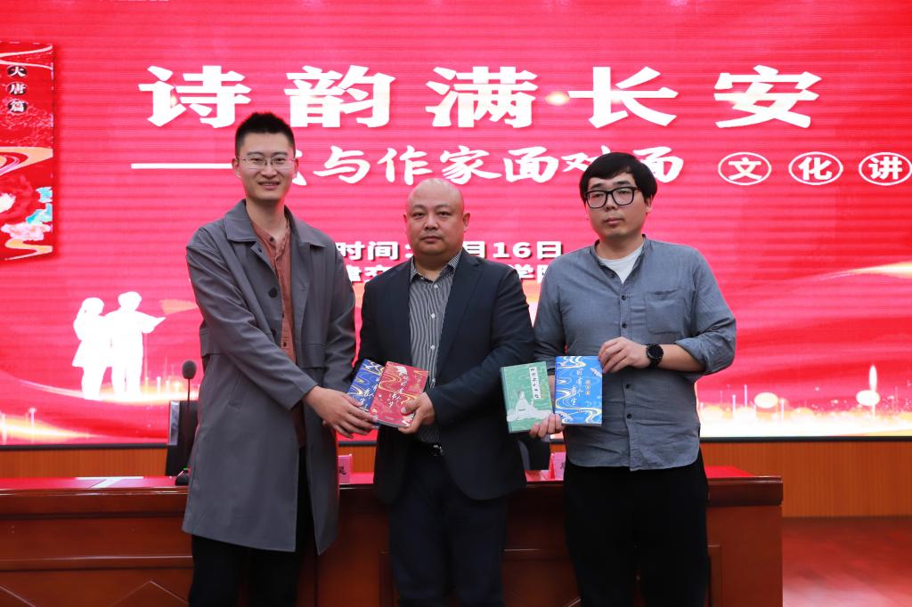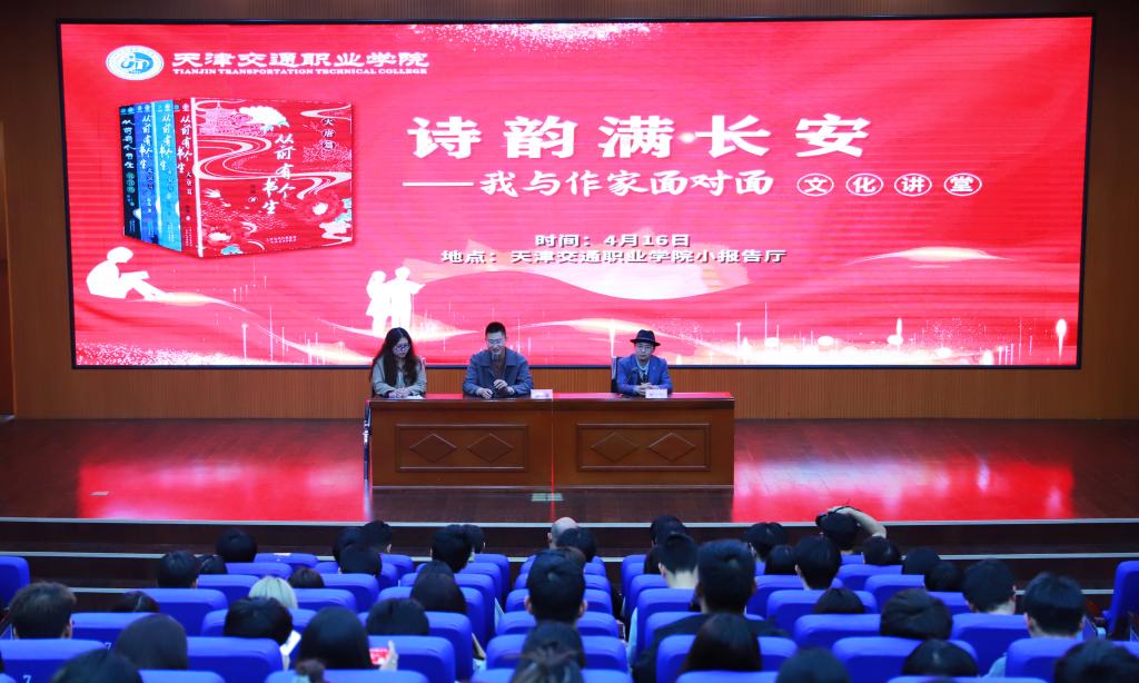 为深入学习贯彻习近平总书记视察天津重要讲话精神,努力践行“四个善作善成”的重要要求,进一步提升校园文化建设,将中华传统文化有机的融入到学院文化建设工作中,不断增强学院师生的文化自信和爱国情怀。4月16日下午,学院统战部与学院图书馆联合百花文艺出版社、津读书苑,共同举办“诗韵满长安—我与作家面对面”文化讲堂。学院赵波副院长、百花文艺出版社杨喆副总经理、百花文艺出版社唐冠群编辑、津读书苑赵鑫店长、著名作家房昊老师出席本次活动。